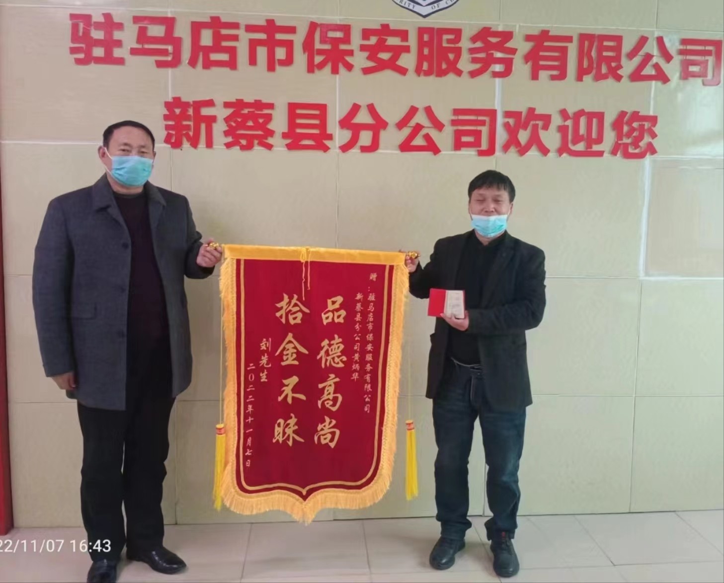 外國語學校崗點保安員黃敏華,在外國語學校附近撿到一個退伍證,想到失主應該很著急,自己能力有限,一時半會也無法找到失主的聯系方式,于是當天把撿到的退伍證交到公司,公司收到后四處聯系找尋失主,經過多方查找聯系到失主。失主于2022年11月7日到公司把退伍證領走。失主這次失而復得的經歷,使他真切的感受到保安公司人員拾金不昧的高尚品質和保安公司助人為樂的雷鋒精神,特送上錦旗一面,表示感謝。