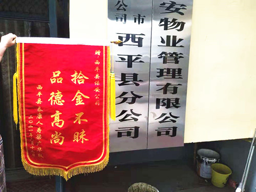 返回舊版?駐馬店市保安服務(wù)有限公司西平縣分公司技防巡邏員張聚才,在2021年6月19日19時(shí)巡邏到西平縣文化路工商銀行ATM內(nèi)拾到一部手機(jī)。巡邏任務(wù)完成后及時(shí)與失主取得聯(lián)系,失主拿到失而復(fù)得手機(jī)連聲說“謝謝”,謝謝!手機(jī)不值幾個(gè)錢,但是手機(jī)內(nèi)信息和微信、支付寶等等都不能用。讓人很著急,要是讓不法分子拾到對我個(gè)人的損失不可想像。第二天失主把一面錦旗送到公司。公司例會(huì)上對張聚才獎(jiǎng)勵(lì)現(xiàn)金100元。公司號召大家對張聚才拾金不昧的精神大家要學(xué)習(xí)和宣傳。