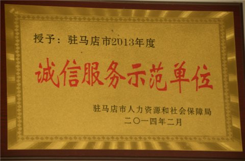 被駐馬店市人力資源和社會保障局授予駐馬店市2013年度誠信服務(wù)示范單位