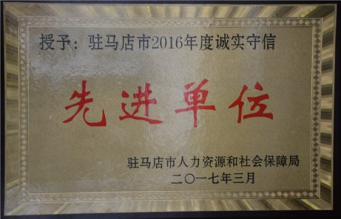 被駐馬店市人力資源和社會保障局授予駐馬店市2016年度誠信服務(wù)示范單位