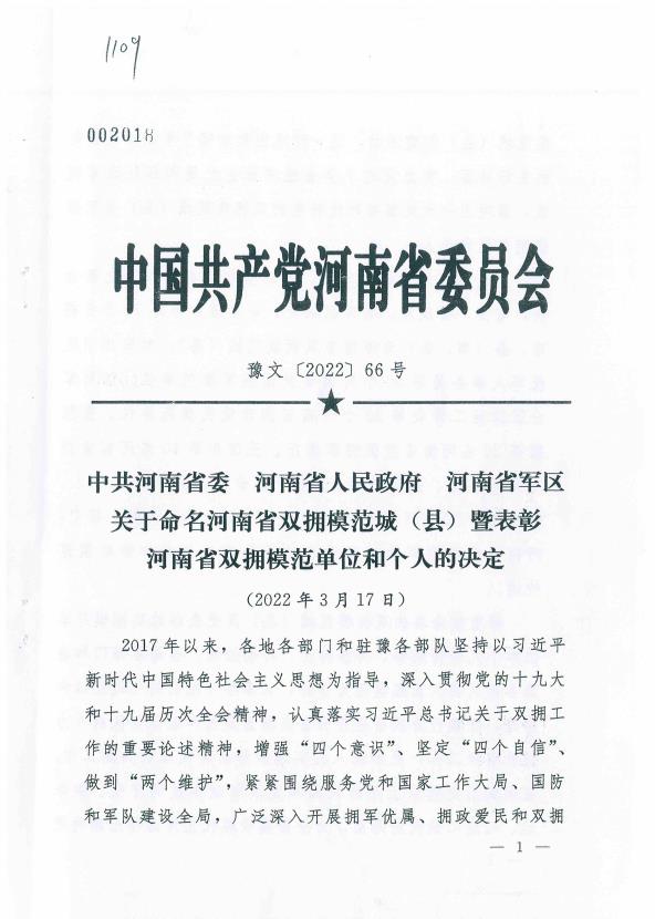 公司被表彰為“河南省雙擁共建示范單位”