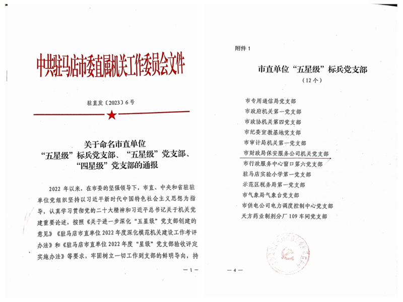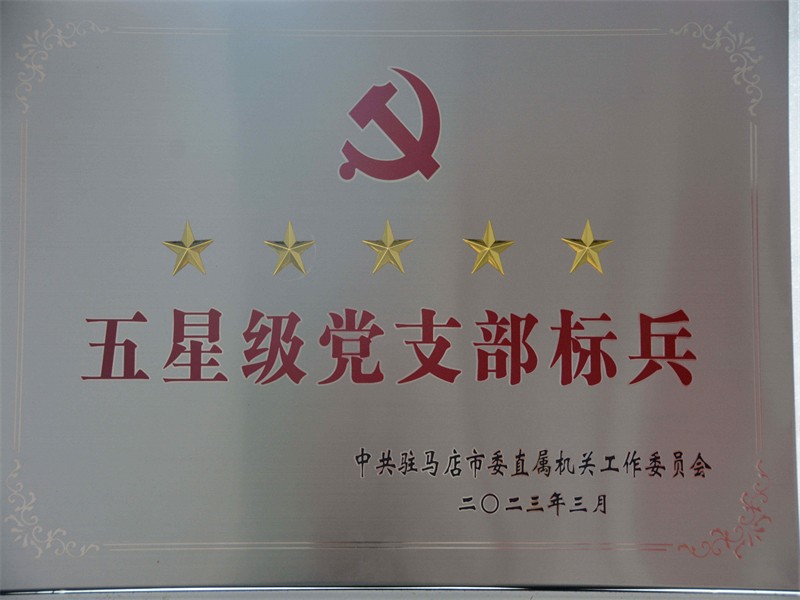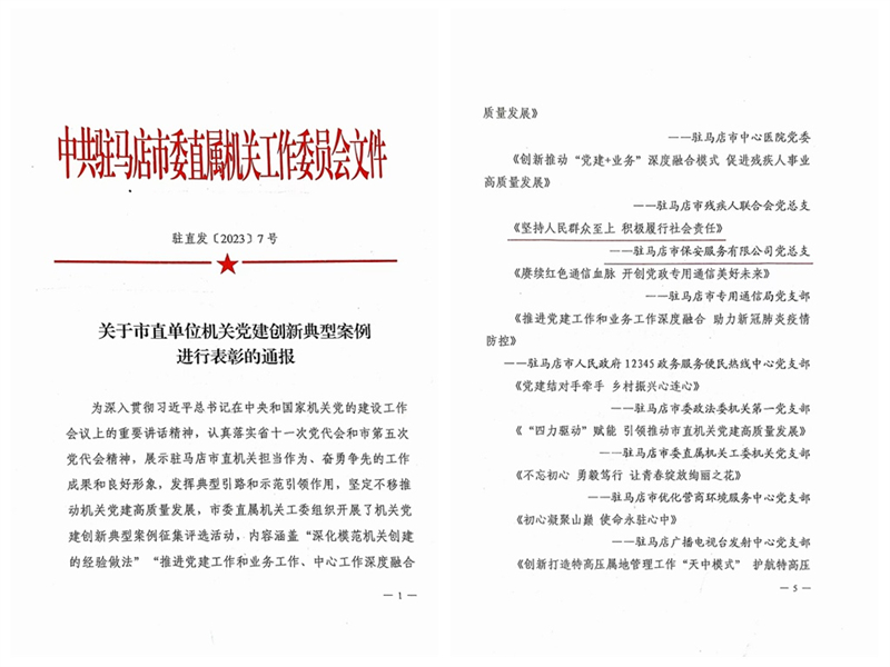 2023年4月25日,駐馬店市保安服務(wù)有限公司機(jī)關(guān)黨支部被駐馬店市直屬機(jī)關(guān)工作委員會(huì)表彰為“五星級(jí)”標(biāo)兵黨支部。