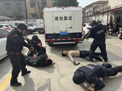 演練模擬了押運(yùn)途中遭遇不法分子襲擊的場景。當(dāng)押運(yùn)車輛停靠時(shí),“歹徒”突然出現(xiàn),試圖搶劫押運(yùn)財(cái)物。押運(yùn)人員迅速反應(yīng),按照預(yù)定應(yīng)急方案,一方面利用車輛作為掩體,持槍警戒,與“歹徒”對(duì)峙;另一方面,部分人員果斷采取行動(dòng),制服靠近的“歹徒”,整個(gè)過程配合默契、行動(dòng)迅速。